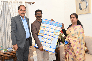 मुख्यमंत्री हेमन्त सोरेन से आज कांके रोड रांची स्थित मुख्यमंत्री आवासीय कार्यालय में झारखंड राज्य खाद्य आयोग के अध्यक्ष श्री हिमांशु शेखर चौधरी ने मुलाकात की। इस अवसर पर मुख्यमंत्री ने झारखण्ड राज्य खाद्य आयोग द्वारा जारी वर्ष-2023 कैलेन्डर का अनावरण किया। आयोग द्वारा राष्ट्रीय खाद्य सुरक्षा अधिनियम के प्रावधानों और जनता को मिले इस निमित्त उनके अधिकारों से अवगत करने के लिये इस वर्ष कैलेंडर प्रकाशित कराई गई है। आयोग द्वारा जारी यह कैलेंडर राज्य के सभी पंचायतों के पंचायत भवन एवं सभी प्रखण्ड कार्यालय में लगाया जाना है। गंतव्य स्थान तक कैलेंडर पहुँचाने की प्रक्रिया मुख्यमंत्री के अनावरण के बाद प्रारंभ कर दिया गया है। कैलेंडर में जनवितरण प्रणाली के अन्तर्गत किस दर पर कितना अनाज मिलना है, विद्यालयों में मध्याह्न भोजन किस प्रावधान के तहत् मिलना है, आंगनबाड़ी केन्द्रों में राष्ट्रीय खाद्य सुरक्षा अधिनियम के अन्तर्गत कौन सी योजनाएँ संचालित हैं, प्रधानमंत्री मातृ वंदना योजना के संदर्भ की जानकारी, एक राष्ट्र एक राशन कार्ड का विवरण उपलब्ध कराने के साथ-साथ राष्ट्रीय खाद्य सुरक्षा अधिनियम के तहत् खाद्य सुरक्षा भत्ता की जानकारी भी उपलब्ध कराई गई है। कैलेंडर में झारखण्ड राज्य आकस्मिक खाद्यान्न कोष की भी विवरण दी गई है। कैलेंडर में निगरानी समिति का विवरण भी दिया गया है। इसके अलावे इस बात की भी विवरण कैलेंडर में उपलब्ध कराई है कि कौन लोग राशन कार्ड के हकदार नहीं हैं। कैलेंडर में खाद्य सुरक्षा अधिनियम से सम्बन्धित शिकायत को आयोग में दर्ज कराने के लिये वाट्सएप्प नं0-9142622194 मोटे अक्षरों में सबसे ऊपर अंकित किया गया है।